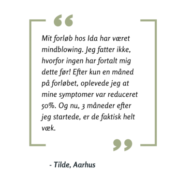 “Mit forløb hos Ida har været mindblowing. Jeg fatter ikke, hvorfor ingen har fortalt mig dette før! Efter kun en måned på forløbet, oplevede jeg at mine symptomer var reduceret 50%. Og nu, 3 måneder efter jeg startede, er de faktisk helt væk.”