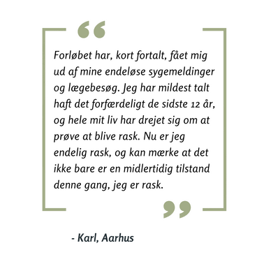 “Forløbet har, kort fortalt, fået mig ud af mine endeløse sygemeldinger og lægebesøg. Jeg har mildest talt haft det forfærdeligt de sidste 12 år, og hele mit liv har drejet sig om at prøve at blive rask. Nu er jeg endelig rask, og kan mærke at det ikke bare er en midlertidig tilstand denne gang, jeg er rask.”